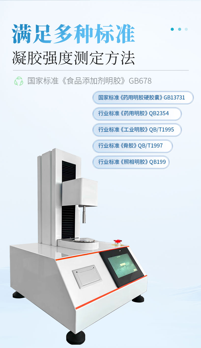 凝膠強度測儀適用于凝膠、果膠、硅膠、結冷膠、卡拉膠、瓊脂、阿拉伯膠、黃原膠、魔芋膠和瓜爾膠等的破裂強度、彈性、延展性、拉伸強度、粘附度、回復性等測試。凝膠強度測儀也叫凍力強度儀 ,明膠凝凍強度測定儀,組織分析儀或凍力測試儀。滿足標準:1、國標GB6783-2013 《食品添加劑明膠》中有關于凝膠強度的