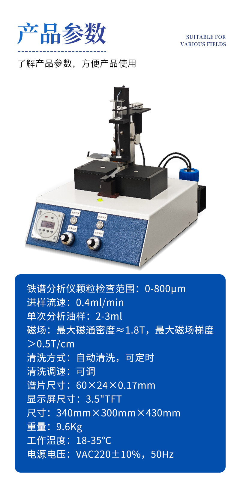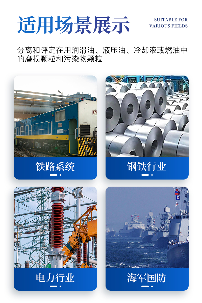 (14)應(yīng)用范圍:用以分離和評定在用潤滑油、液壓油、冷卻液或燃油中的磨損顆粒和污染物顆粒;